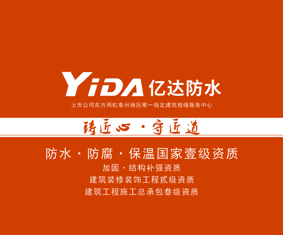 泰興市億達防水工程有限公司是一家具有國家建筑企業(yè)防水防腐保溫工程一級資質、土建總承包三級資質的企業(yè),坐落于江蘇省泰興市高新技術產(chǎn)業(yè)開發(fā)區(qū)人才科技廣場,成立于2012年,公司本著開拓創(chuàng)新、不斷進取的精神與恒大、碧桂園、榮創(chuàng)、中梁、新希望、融信、海亮等國內知名房地產(chǎn)商及中國建筑、中冶建筑、中鐵建筑等國內知名央企保持著長期緊密合作,截止2018年底公司年產(chǎn)值突破1.5億元。公司經(jīng)營防腐保溫工程施工、防水材料設計及銷售、建筑工程防水修繕等業(yè)務,于2017年與國內防水龍頭上市公司東方雨虹簽訂戰(zhàn)略合作關系,成立東方雨虹泰州服務中心。多年來憑著億達人的不懈努力,公司業(yè)務已遍及全國七省26市。